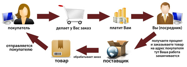 Данная модель работы предоставляет розничную реализацию товара посреднику, который функционально обеспечивает «витрину» (как правило, это интернет-магазины, интернет-аукционы, группы в социальных сетях и т.д.). Данные по осуществленным заказам и оплату за них посредник передает компании-поставщику, которая берёт на себя все заботы по упаковке и пересылке товара покупателю. При этом отправка товара осуществляется от лица посредника, а при необходимости, и в фирменной упаковке с логотипом посредника. Сам же посредник (владелец интернет-магазина) не нуждается ни в собственном складе, ни запасе товара. Поможем начать бизнес с нуля без вложений, без опыта в сфере продаж, и даже без действующего интернет-магазина. Предоставляем бесплатное обучение и полное сопровождение Вашего бизнеса.