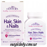 Комплекс витаминов для волос, кожи и ногтей от 21st Century - это формула здорового обновления с антиоксидантами, витаминами и минералами. В составе 5000 мкг биотина в одной порции.
